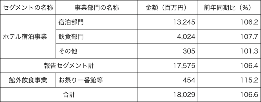 TSMCの工場建設に伴う宿泊特需は落ち着いたものの、ドミナント効果やネット販売強化施策などにより宿泊利用が堅調であったことに加え、北部九州総体、佐賀国民スポーツ大会の開催に伴うスポーツ団体利用の増加や館内外の飲食店舗の利用が増加しております。これらの結果、売上高は180億29百万円(前事業年度は169億7百万円)となりました。