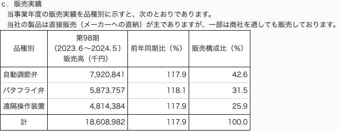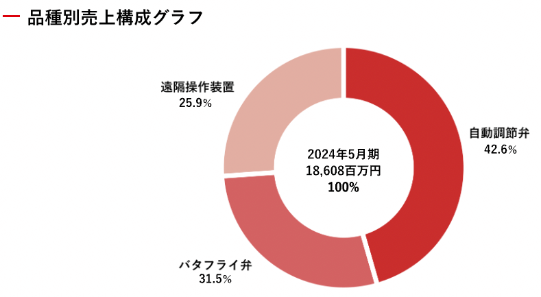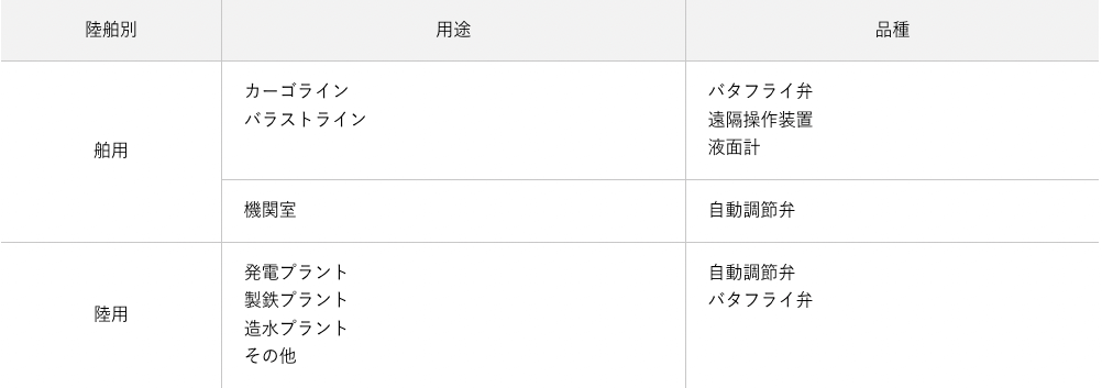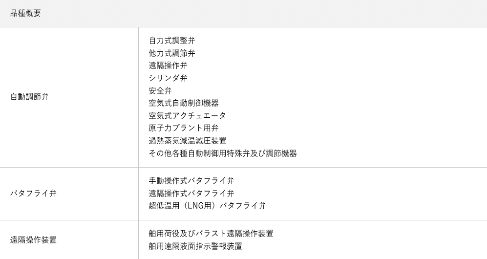 流体制御装置の総合メーカーとして、舶用(タンカーのカーゴライン、バラストライン、機関室)及び陸用(発電その他プラント)に各種自動調節弁、バタフライ弁、遠隔操作装置等の製造、販売をおこなっています。