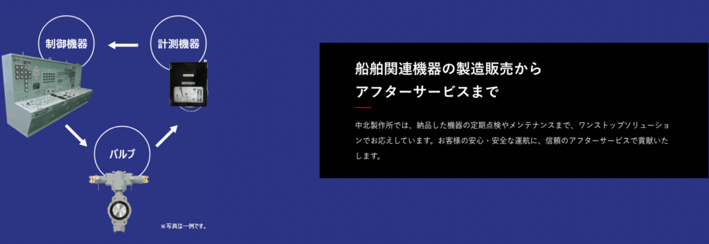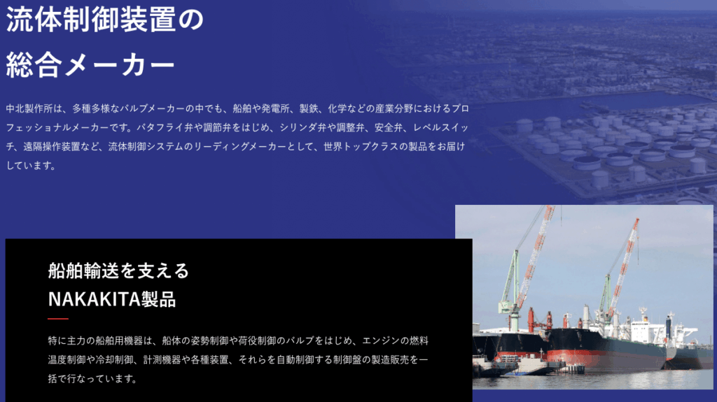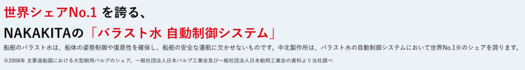 造船業界:中北製作所は、船舶用バルブ、特にバタフライバルブとその遠隔操作装置において、国内でほぼ100%のシェア、中国・韓国で約50%のシェアを誇っています。