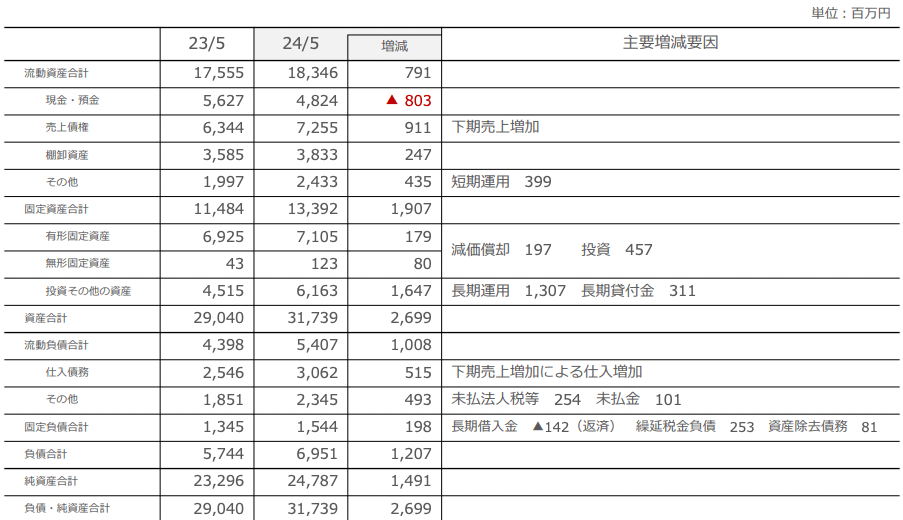 主な資産内訳は、現金及び預金5,492百万円、売上債権10,958百万円、棚卸資産5,420百万円、前渡金1,108百万円、建物(純額)804百万円、土地6,497百万円、投資有価証券2,675百万円であります。